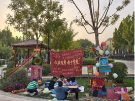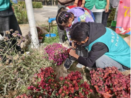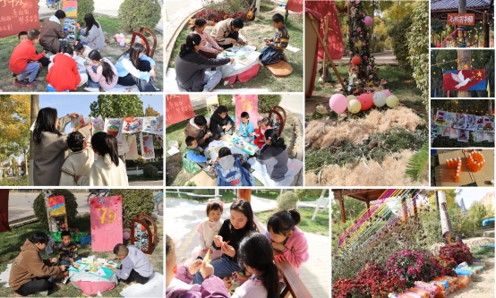 活动分为多个板块,内容丰富多彩:“同心迹”环节中,风景园林专业研究生同居民与孩子们用画笔绘祝福,用彩纸折五角星,以指尖艺术表达对家国的热爱;“绘芳华”区域结合彩虹线打卡与秋日植物拓印,让参与者在自然与艺术的交融中记录新疆秋日美景;“共生墙”由林业专业研究生与居民齐心打造花墙,展现园艺与手工艺术的完美结合;“焕新生”活动鼓励居民彩绘废旧瓶,传递环保理念;“续传承”板块以老照片讲述“三五九旅”的垦荒历史,年轻父母带孩子认真聆听,兵团精神在代际共鸣中延续。