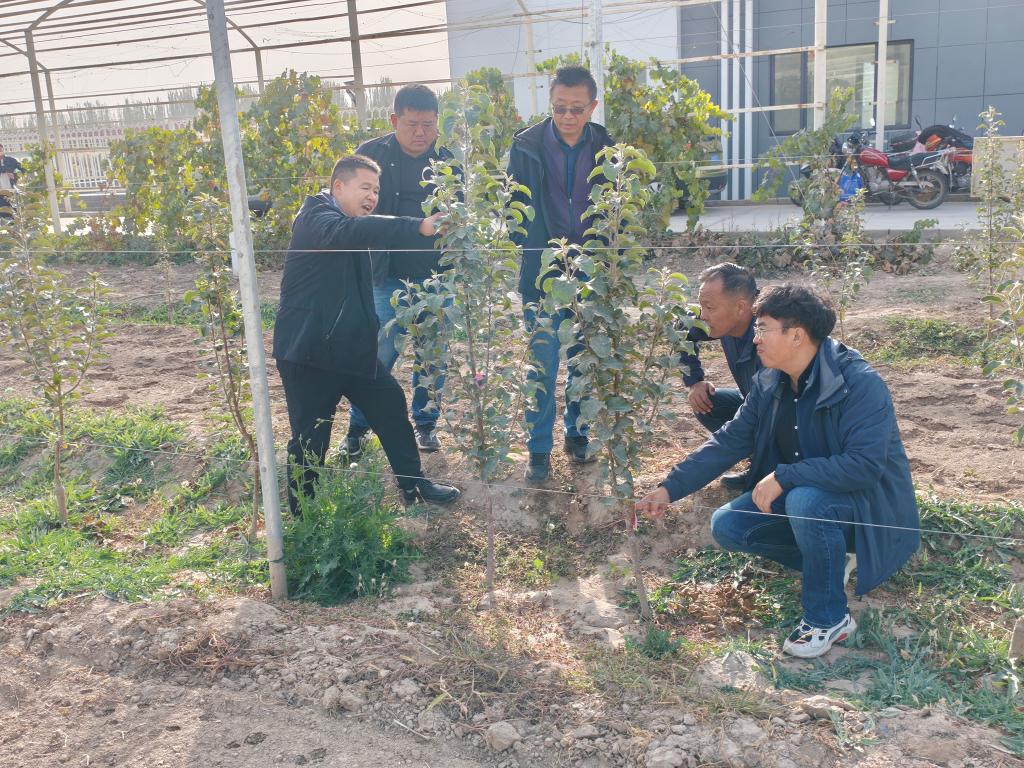 苹果团队先赴五团苹果全产业链育苗实验基地,了解基建、功能区及果园品种,与农发办交流种植技术、用料施肥,指导优化老果园“高接换优”嫁接技术与滴管铺设,与当地农业和林业草原中心主任、果业龙头企业研讨产学研结合方案,并为科技成果转化落地与基地建设提供针对性建议。团队紧接着前往五团矮砧密植苹果示范园,参观高标准示范园,分析区位与品种特性、研讨种植方法以及机械化作业配套建园模式,并给出思路指导。