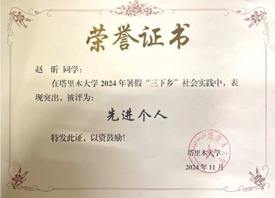 个人事迹:在校期间,我始终秉持“扎根边疆、服务农林”的信念,积极参与学院组织的三下乡社会实践“植说阿拉尔”,连续两年对第一师植被进行调研与生态宣讲,累计服务时长超过100小时。