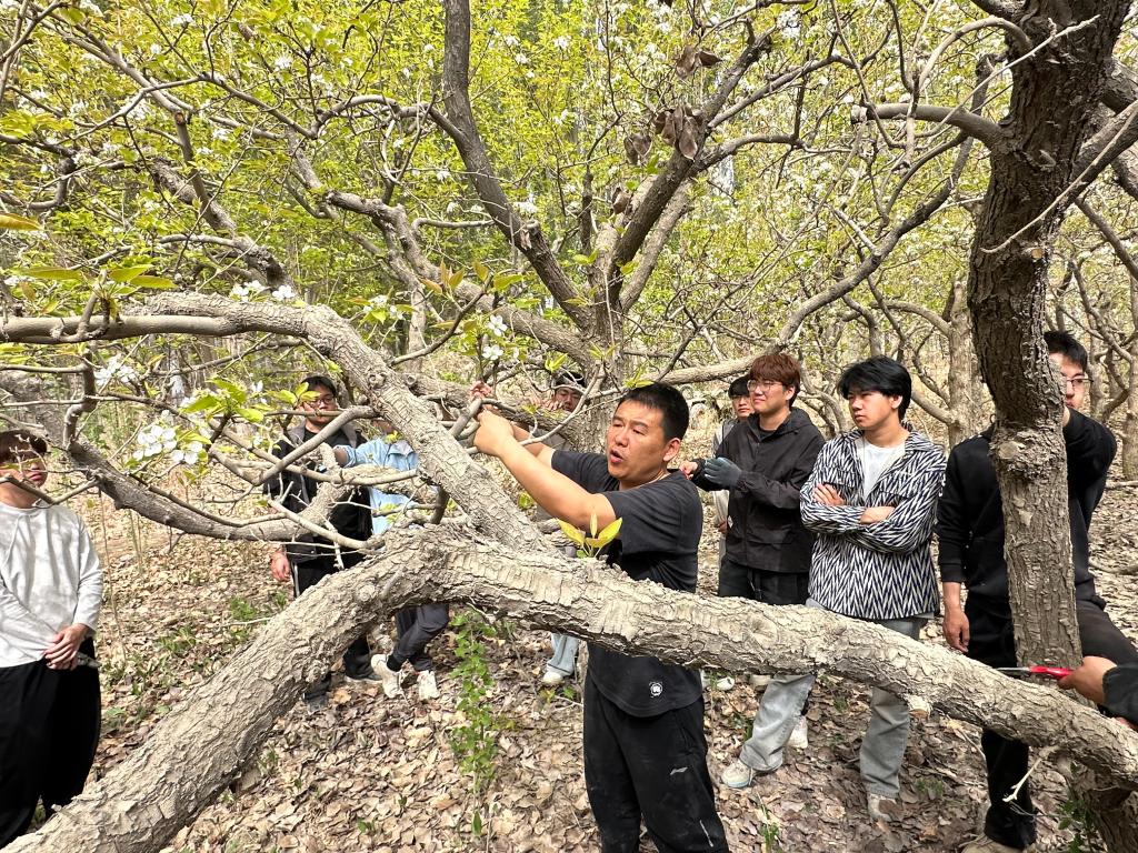 冯一峰老师采用“理论讲解+现场示范+一对一指导”的教学模式,使得同学们快速掌握修剪技术要点,同学们围在果树旁认真聆听,随后分组上手实操,逐步掌握了不同修剪手法的适用场景,学会了判断枝条去留,体会到“因树修剪、随枝作形”的园艺智慧。嫁接操作实训中,老师现场演示了枝接、芽接等常用嫁接方法,同学们手持嫁接刀反复练习,互相交流技巧,现场学习氛围浓厚。