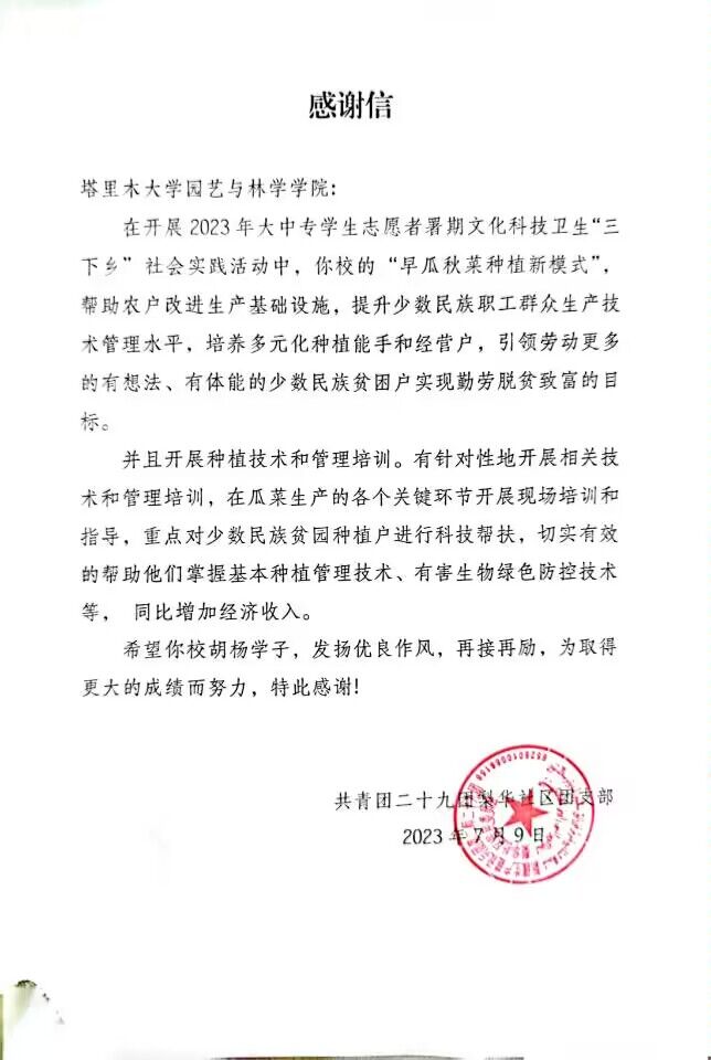表扬信中提到,“瓜菜支农小分队”实践团成员,表现出了极高的志愿精神和综合素养,坚持志愿服务原则,开展相关技术培训,认真负责,积极参与,不畏艰辛,深入实地考察实践、帮助农户提高科技种植意识,对农户的产业种植进行调研并且给予指导。同时,也将希望寄予胡杨青年们“继续努力,为科技助农作出更大贡献”