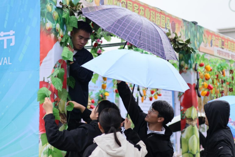 清晨,天空飘着细雨,包建平教授的团队满怀期待地进行会场的布置工作。尽管雨水打湿了衣物,但是师生们依旧热情满满,将《芽变香梨选育及应用示范》项目成果品鉴会场制成一道亮丽的风景线。