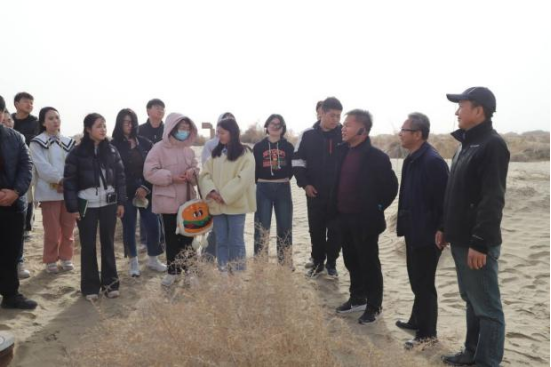 学习期间,十二团水土保持监测站站长为同学们先后介绍了观测塔、积沙仪等监测设备的操作方法和监测原理、当地水土流失过程,并带领同学们近距离观察近地表风沙防治中草方格沙障的设置。