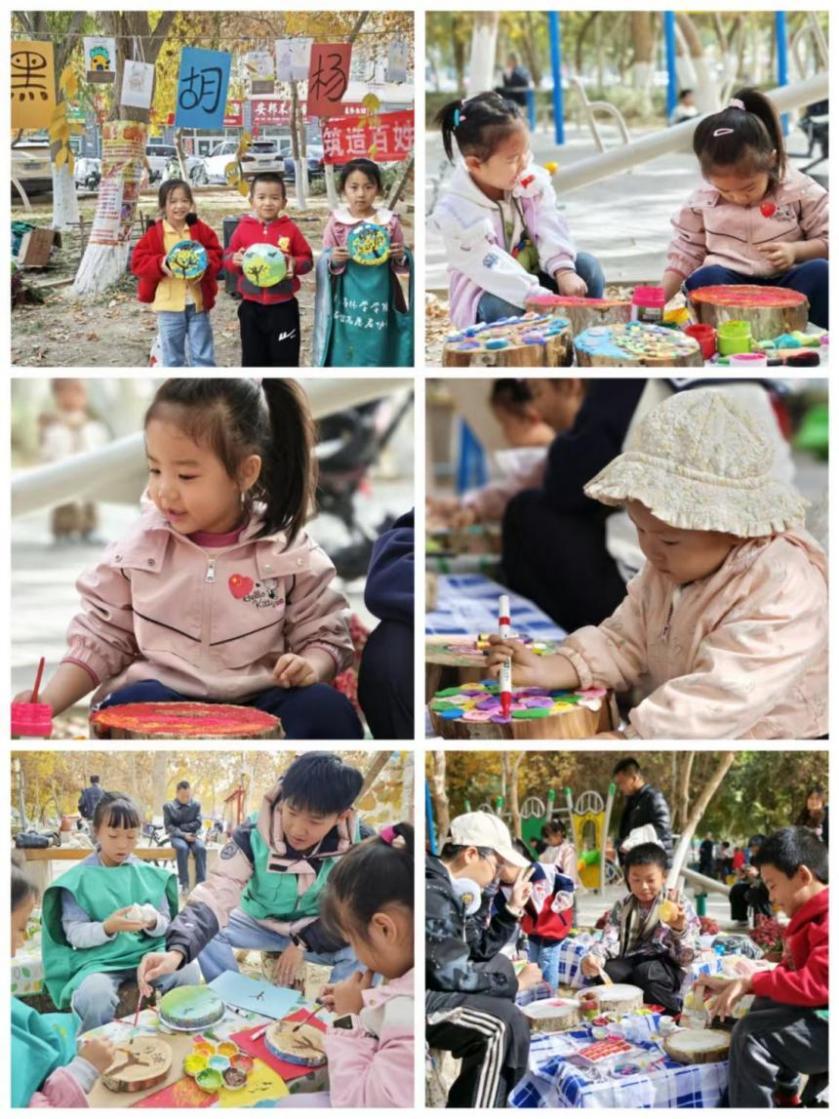 在“拾胡杨”区,孩子们蹲在地上,精心挑选飘落的胡杨叶片,拼贴成一幅幅充满童趣的自然画作;在“绘童梦”区,一块块被岁月打磨的树桩成为画布,让孩子们用彩笔描绘出心中的梦想家园;在“追秋色”帐篷里,用枯枝与落叶搭建的“自然小屋”成了亲子拍照打卡的热门地。